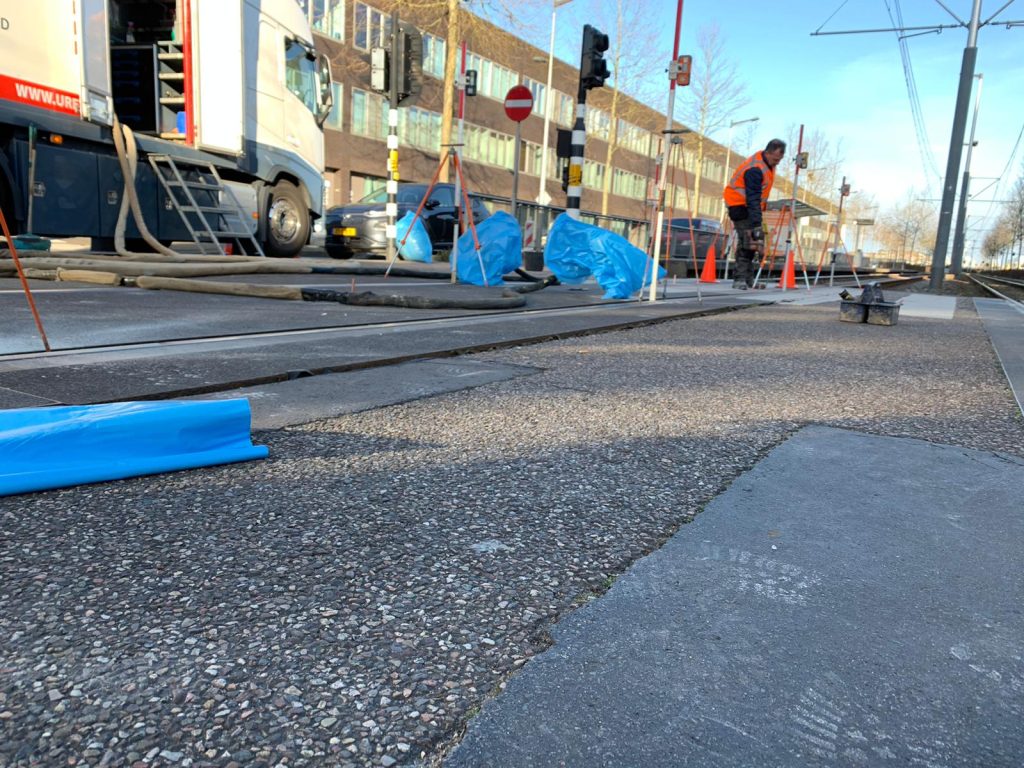 Herman Boswijk, conseiller Tram auprès de la commune d’Amsterdam, raconte : « L’IJtram est en train d’augmenter sa capacité de transport, en faisant circuler des trams couplés. Afin de rendre cela possible, un certain nombre de mesures – en plus de l’extension du dépôt de l’IJtram – ont été nécessaires. L’une d’elles consistait à corriger la position des plaques de support des rails sur deux traversées. C’est ce que nous avons fait en concertation avec De Wilde Spoorwegbouw, KWS et avec l’aide d’URETEK. De Wilde Spoorwegbouw s’est chargé du mesurage, du levage et du bourrage de la voie dans le lit de ballast adjacent. URETEK s’est occupée du levage et de la pose de joints d’assise, et enfin KWS a réparé les revêtements locaux adjacents ».